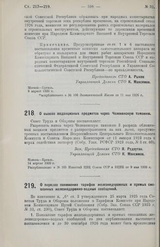 Постановление Совета Труда и Обороны. О порядке понижения тарифов железнодорожных и прямых смешанных железнодорожно-водных сообщений. 28 апреля 1926 г. // Распубликовано в № 105 Известий ЦИК Союза ССР и ВЦИК от 9 мая 1926 г.