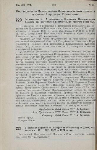 Постановление Центрального Исполнительного Комитета и Совета Народных Комиссаров. О сложении недоимок по штрафам за контрабанду по делам, возникшим в 1921, 1922, 1923 и 1924 годах. 30 апреля 1926 г.