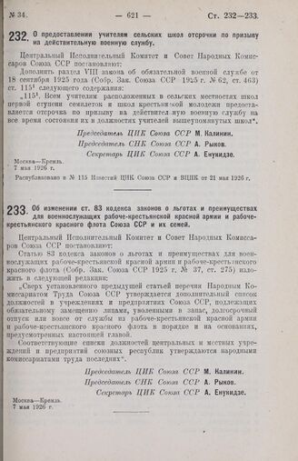 Постановление Центрального Исполнительного Комитета и Совета Народных Комиссаров. О предоставлении учителям сельских школ отсрочки по призыву на действительную военную службу. 7 мая 1926 г. // Распубликовано в № 115 Известий ЦИК Союза ССР и ВЦИК от 21 мая 1926 г.