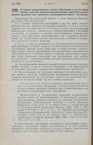Постановление Центрального Исполнительного Комитета и Совета Народных Комиссаров. О порядке предоставления в период мобилизации и на все время военных действий местными исполнительными комитетами органам военного ведомства бань, прачечных, ассениз...