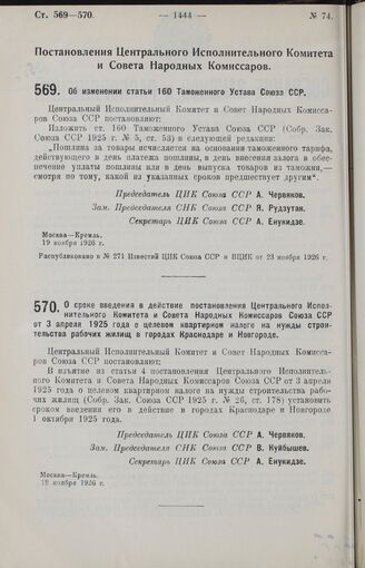 Постановление Центрального Исполнительного Комитета и Совета Народных Комиссаров. О сроке введения в действие постановления Центрального Исполнительного Комитета и Совета Народных Комиссаров Союза ССР от 3 апреля 1925 года о целевом квартирном налоге на нужды строительства рабочих жилищ в городах Краснодаре и Новгороде. 19 ноября 1926 г.