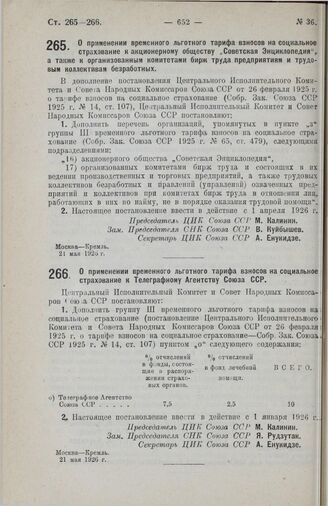 Постановление Центрального Исполнительного Комитета и Совета Народных Комиссаров. О применении временного льготного тарифа взносов на социальное страхование к Телеграфному Агентству Союза ССР. 21 мая 1926 г.
