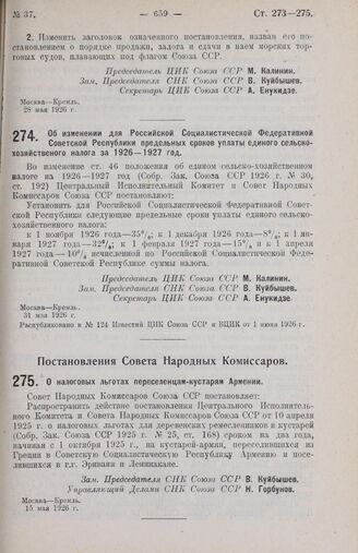 Постановление Центрального Исполнительного Комитета и Совета Народных Комиссаров. Об изменении для Российской Социалистической Федеративной Советской Республики предельных сроков уплаты единого сельско-хозяйственного налога за 1926-1927 год. 31 мая 1926 г.