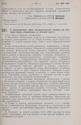 Постановление Совета Труда и Обороны. О предоставлении права преимущественной погрузки для некоторых грузов, отправляемых по железной дороге. 22 мая 1926 г.