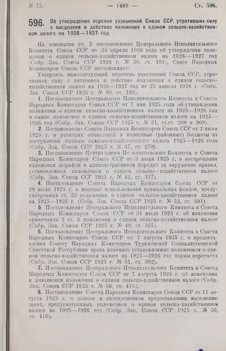 Постановление Совета Народных Комиссаров. Об утверждении перечня узаконений Союза ССР, утративших силу, с введением в действие положения о едином сельско-хозяйственном налоге на 1926-1927 год. 23 ноября 1926 г.