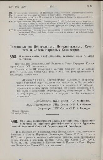 Постановление Центрального Исполнительного Комитета и Совета Народных Комиссаров. О местном налоге с нефтепродуктов, вывозимых через г. Батум за-границу. 26 ноября 1926 г.
