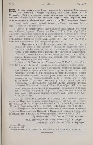 Постановление Центрального Исполнительного Комитета и Совета Народных Комиссаров. О дополнении статьи 1 постановления Центрального Исполнительного Комитета и Совета Народных Комиссаров Союза ССР от 23 октября 1925 г. о порядке наложения взысканий за нарушение постановлений об акцизах и особом патентном сборе за право торговли спиртными напитками и табачными изделиями и ст. 279 Таможенного Устава. 17 декабря 1926 г.