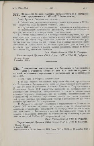 Постановление Совета Труда и Обороны. О приравнении землетрясения в г. Ленинакане и Ленинаканском уезде к страховому случаю от огня и о сложении недоимок и платежей по окладному страхованию с пострадавшего от землетрясения населения. 3 декабря 1926 г.