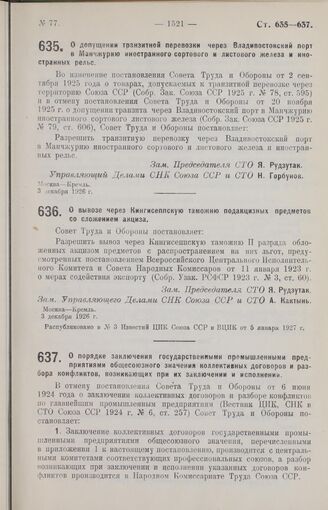 Постановление Совета Труда и Обороны. О допущении транзитной перевозки через Владивостокский порт в Манчжурию иностранного сортового и листового железа и иностранных рельс. 3 декабря 1926 г.