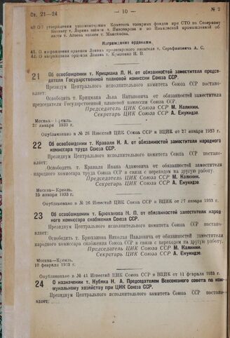 Об освобождении т. Крицмана Л.Н. от обязанностей заместителя председателя Государственной плановой комиссии Союза ССР. 21 января 1933 г. // Опубликовано в № 26 Известий ЦИК Союза ССР и ВЦИК от 27 января 1933 г.