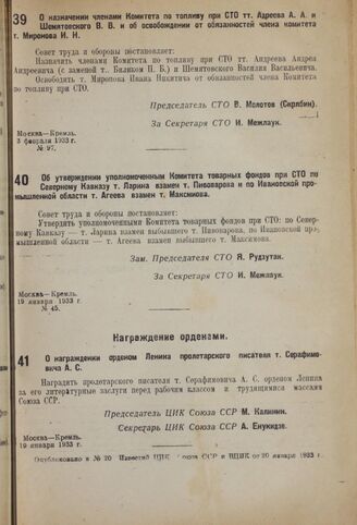 Об утверждении уполномоченным Комитета товарных фондов при СТО по Северному Кавказу т. Ларина взамен т. Пивоварова и по Ивановской промышленной области т. Агеева взамен т. Максимова. 19 января 1933 г. № 45