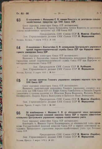Об освобождении т. Минаева С.В. от обязанностей члена президиума Государственной плановой комиссии Союза ССР и первого заместителя начальника Центрального управления народно-хозяйственного учета. 3 марта 1933 г. № 351