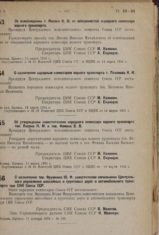 Об освобождении т. Янсона Н.М. от обязанностей народного комиссара водного транспорта. 13 марта 1934 г. // Опубликовано в № 62 Известий ЦИК Союза ССР и ВЦИК от 14 марта 1934 г.