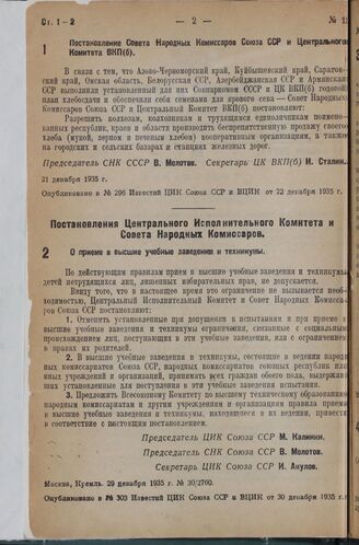 Постановление Центрального Исполнительного Комитета и Совета Народных Комиссаров. О приеме в высшие учебные заведения и техникумы. 29 декабря 1935 г. № 30/2760 // Опубликовано в № 303 Известий ЦИК Союза ССР и ВЦИК от 30 декабря 1935 г.