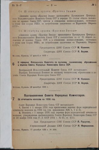 Постановление Совета Народных Комиссаров. Об отчетности колхозов на 1936 год. 17 декабря 1935 г. № 2691