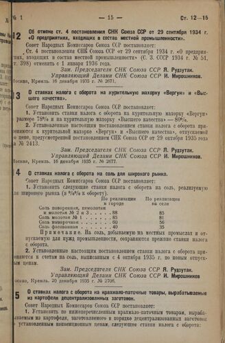 Постановление Совета Народных Комиссаров. Об отмене ст. 4 постановления СНК Союза ССР от 29 сентября 1934 г. «О предприятиях, входящих в состав местной промышленности». 16 декабря 1935 г. № 2671