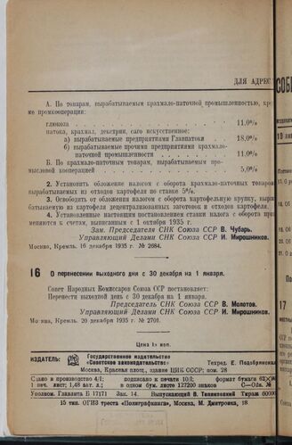 Постановление Совета Народных Комиссаров. О перенесении выходного дня с 30 декабря на 1 января. 20 декабря 1935 г. № 2701