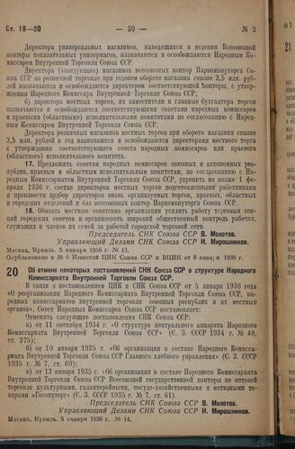Постановление Совета Народных Комиссаров. Об отмене некоторых постановлений СНК Союза ССР о стpуктype Народного Комиссариата Внутренней Торговли Союза ССР. 5 января 1936 г. № 14