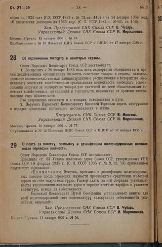 Постановление Совета Народных Комиссаров. Об ограничении экспорта в некоторые страны. 16 января 1936 г. № 77