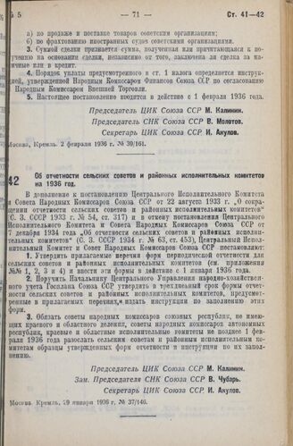 Постановление Центрального Исполнительного Комитета и Совета Народных Комиссаров. Об отчетности сельских советов и районных исполнительных комитетов на 1936 год. 29 января 1936 г. № 37/146
