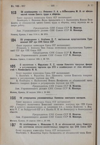 Об освобождении т. Малышева С.В. от обязанностей члена Комитета по заготовкам сельско-хозяйственных продуктов при СНК Союза ССР. 29 апреля 1934 г. № 1017
