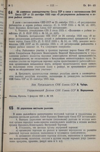 Постановление Совета Народных Комиссаров. Об управлении местными рынками. 4 февраля 1936 г. № 176