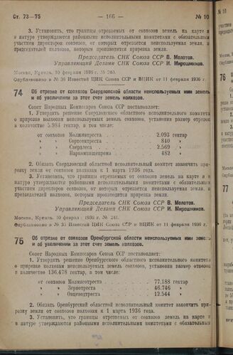 Постановление Совета Народных Комиссаров. Об отрезке от совхозов Свердловской области неиспользуемых ими земель и об увеличении за этот счет земель колхозов. 10 февраля 1936 г. № 241 // Опубликовано в № 36 Известий ЦИК Союза ССР и ВЦИК от 11 февраля 1936 г.