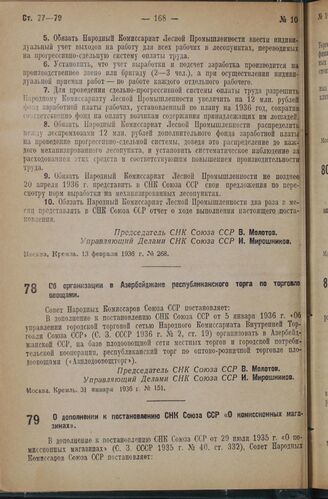 Постановление Совета Народных Комиссаров. О дополнении к постановлению СНК Союза ССР «О комиссионных магазинах». 3 февраля 1936 г. № 162