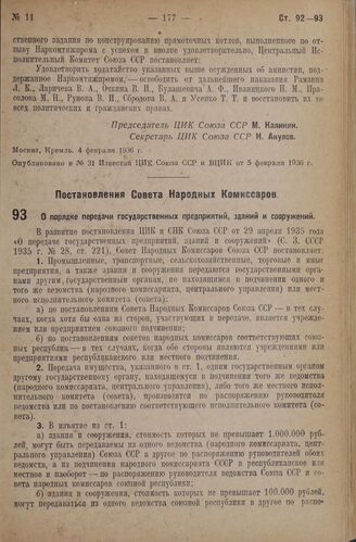 Постановление Совета Народных Комиссаров. О порядке передачи государственных предприятий, зданий и сооружений. 15 февраля 1936 г. № 254