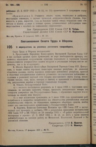 Постановление Совета Труда и Обороны. О мероприятиях по усилению розничного товарооборота. 17 февраля 1936 г. № 77