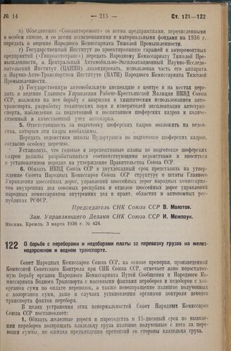 Постановление Совета Народных Комиссаров. О борьбе с переборами и недоборами платы за перевозку грузов на железнодорожном и водном транспорте. 25 февраля 1936 г. № 362
