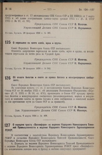 Постановление Совета Народных Комиссаров. Об оплате билетов и плате за провоз багажа в международных сообщениях. 9 марта 1936 г. № 468