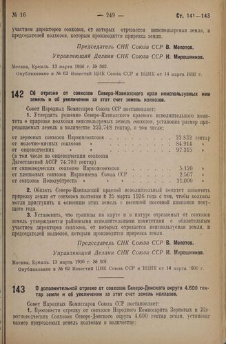 Постановление Совета Народных Комиссаров. О дополнительной отрезке от совхозов Северо-Донского округа 4600 гектар земли и об увеличении за этот счет земель колхозов. 22 марта 1936 г. № 547 // Опубликовано в № 70 Известий ЦИК Союза ССР и ВЦИК от 23 марта 1936 г.