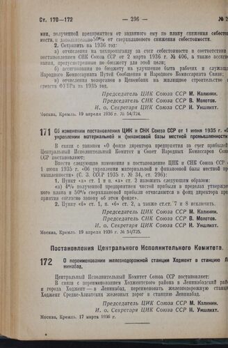 Постановление Центрального Исполнительного Комитета и Совета Народных Комиссаров. Об изменении постановления ЦИК и СНК Союза ССР от 1 июня 1935 г. «Об укреплении материальной и финансовой базы местной промышленности». 19 апреля 1936 г. № 54/725