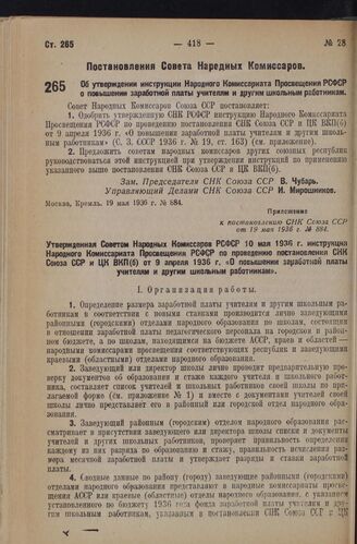 Постановление Совета Народных Комиссаров. Об утверждении инструкции Народного Комиссариата Просвещения РСФСР о повышении заработной платы учителям и другим школьным работникам. 19 мая 1936 г. № 884