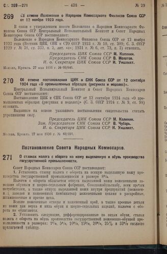 Постановление Центрального Исполнительного Комитета и Совета Народных Комиссаров. Об отмене постановления ЦИК и СНК Союза ССР от 12 сентября 1924 года «О промышленных образцах (рисунках и моделях)». 27 мая 1936 г. № 60/956