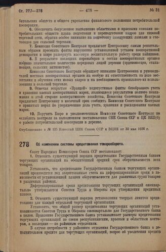 Постановление Совета Народных Комиссаров. Об изменении системы кредитования товарооборота. 4 июня 1936 г. № 988