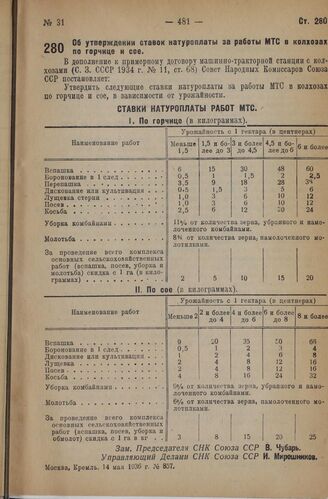 Постановление Совета Народных Комиссаров. Об утверждении ставок натуроплаты за работы МТС в колхозах по горчице и сое. 14 мая 1936 г. № 857