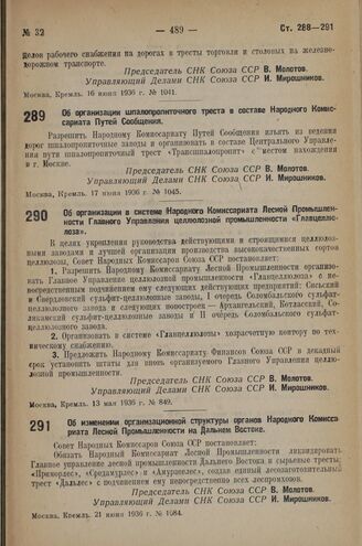 Постановление Совета Народных Комиссаров. Об изменении организационной структуры органов Народного Комиссариата Лесной Промышленности на Дальнем Востоке. 21 июня 1936 г. № 1084