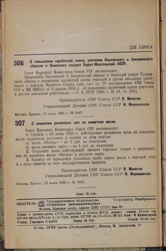 Постановление Совета Народных Комиссаров. О снижении розничных цен на животное масло. 13 июня 1936 г. № 1023