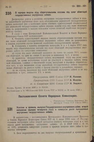 Постановление Центрального Исполнительного Комитета и Совета Народных Комиссаров. О порядке выдачи ссуд сберегательными кассами под залог облигаций государственных внутренних займов. 20 июля 1936 г. № 68/1301 // Опубликовано в № 168 Известий ЦИК Союза ССР и ВЦИК от 21 июля 1936 г.