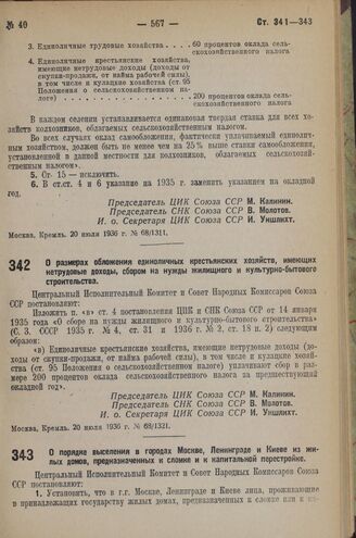 Постановление Центрального Исполнительного Комитета и Совета Народных Комиссаров. О размерах обложения единоличных крестьянских хозяйств, имеющих нетрудовые доходы, сбором на нужды жилищного и культурно-бытового строительства. 20 июля 1936 г. № 68...
