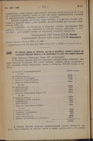 Постановление Совета Народных Комиссаров. Об отрезке земель от совхозов, орс‘ов и подсобных хозяйств разных организаций Курской области и об увеличении за этот счет земель колхозов. 14 июля 1936 г. № 1263