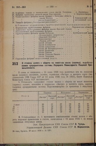 Постановление Совета Народных Комиссаров. О ставках налога с оборота на животное масло (коровье), вырабатываемое предприятиями системы Народного Комиссариата Пищевой Промышленности. 26 июля 1936 г. № 1351