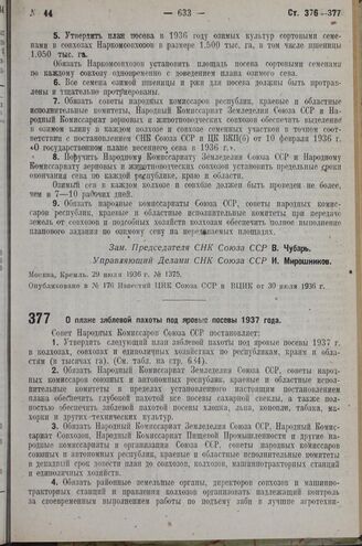 Постановление Совета Народных Комиссаров. О плане зяблевой пахоты под яровые посевы 1937 года. 1 августа 1936 г. № 1390