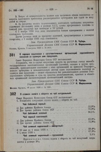 Постановление Совета Народных Комиссаров. О порядке взыскания с заготовительных организаций задолженности колхозам за сданную ими продукцию. 19 июля 1936 г. № 1281