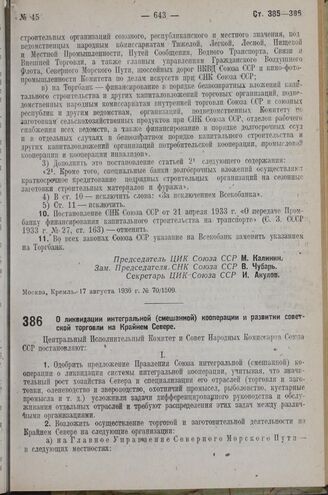 Постановление Центрального Исполнительного Комитета и Совета Народных Комиссаров. О ликвидации интегральной (смешанной) кооперации и развитии советской торговли на Крайнем Севере. 17 августа 1936 г. № 70/1516