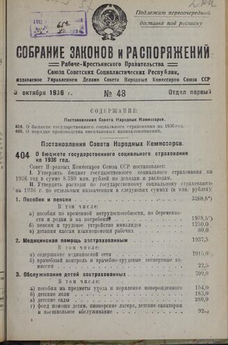 Постановление Совета Народных Комиссаров. О бюджете государственного социального страхования на 1936 год. 4 сентября 1936 г. № 1619
