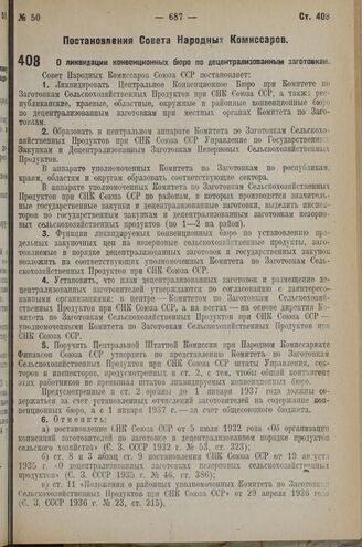 Постановление Совета Народных Комиссаров. О ликвидации конвенционных бюро по децентрализованным заготовкам. 31 августа 1936 г. № 1595