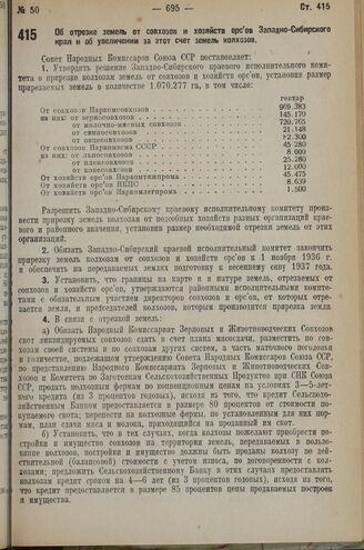 Постановление Совета Народных Комиссаров. Об отрезке земель от совхозов и хозяйств орс’ов Западно-Сибирского края и об увеличении за этот счет земель колхозов. 3 октября 1936 г. № 1790
